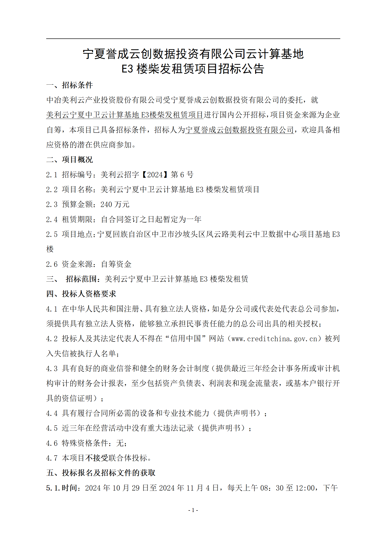 中冶美利云產(chǎn)業(yè)投資股份有限公司受寧夏譽成云創(chuàng)數(shù)據(jù)投資有限公司的委托,就美利云寧夏中衛(wèi)云計算基地E3樓柴發(fā)租賃項目進行國內(nèi)公開招標,項目資金來源為企業(yè)自籌,本項目已具備招標條件,招標人為寧夏譽成云創(chuàng)數(shù)據(jù)投資有限公司,歡迎具備相應資格的潛在供應商參加。